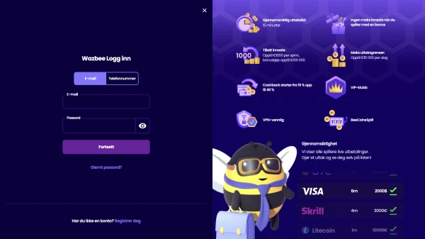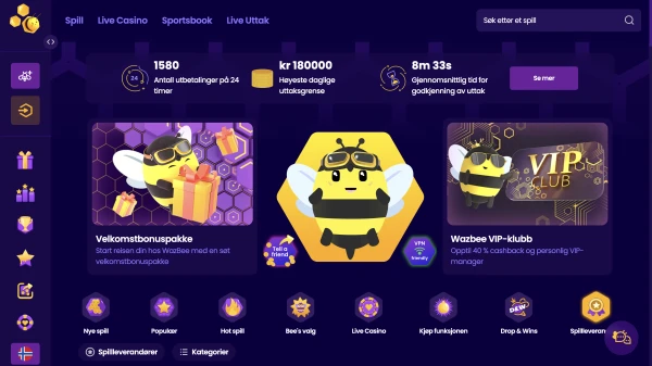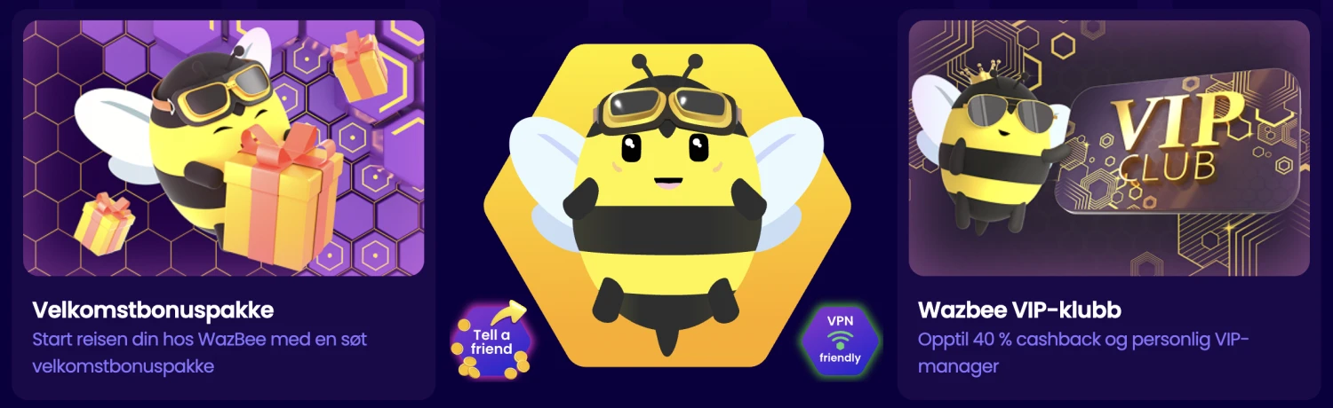 Hvis du vil komme raskt i gang, er velkomsttilbudet vÄrt tilgjengelig fra et minimumsinnskudd pÄ 200 kr. Du kan ogsÄ utforske BeeCoins-lojalitetsprogrammet vÄrt og et VIP-program for spillere pÄ hÞyere nivÄ. Nedenfor er en rask oversikt over hva du fÄr hos Wazbee casino Norge, og hvordan Wazbee passer inn i en moderne, mobil-fÞrst-rutine.
