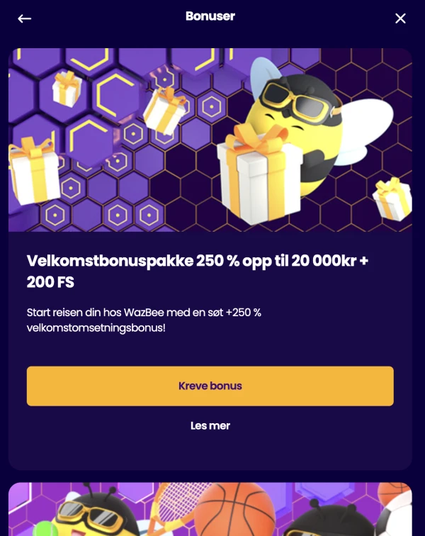 Hovedpakken vÄr er et velkomsttilbud i fire trinn, hver med minimumsinnskudd pÄ 200 kr og et omsetningskrav pÄ 30x pÄ bonusbelÞpet. FÞrste innskudd gir 125% opptil 2,000 kr NOK pluss 50 free spins, etterfulgt av tre innskudd til med matchbonuser og 50 free spins hver. Vi lister ikke en Wazbee casino bonus uten innskudd som et fast standardtilbud i kassen, sÄ sjekk alltid kampanjesiden for tidsbegrensede alternativer og detaljer om kvalifisering. Hvis du ser en kampanje for Wazbee casino bonus uten innskudd, vil den ha egne regler og grenser pÄ samme sted.