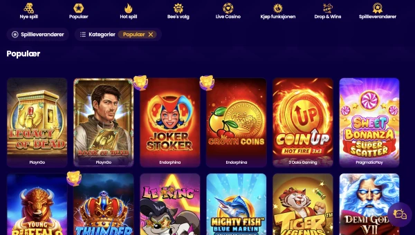| VIP-fordeler | VIP-program + BeeCoins lojalitetsbelĂžnninger (mynter for kontantbonuser eller gratisspinn) |